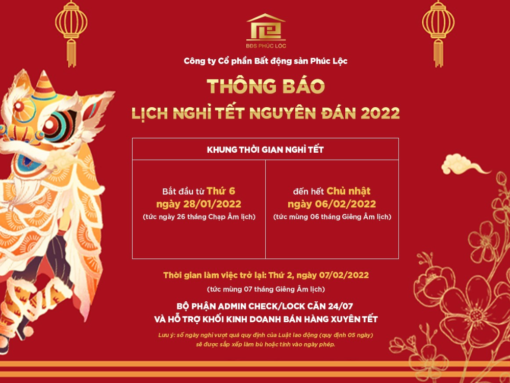 Công ty Cổ phần Bất động sản Phúc Lộc (BĐS Phúc Lộc) xin trân trọng thông báo đến Quý Khách hàng & Quý Đối tác lịch[...]