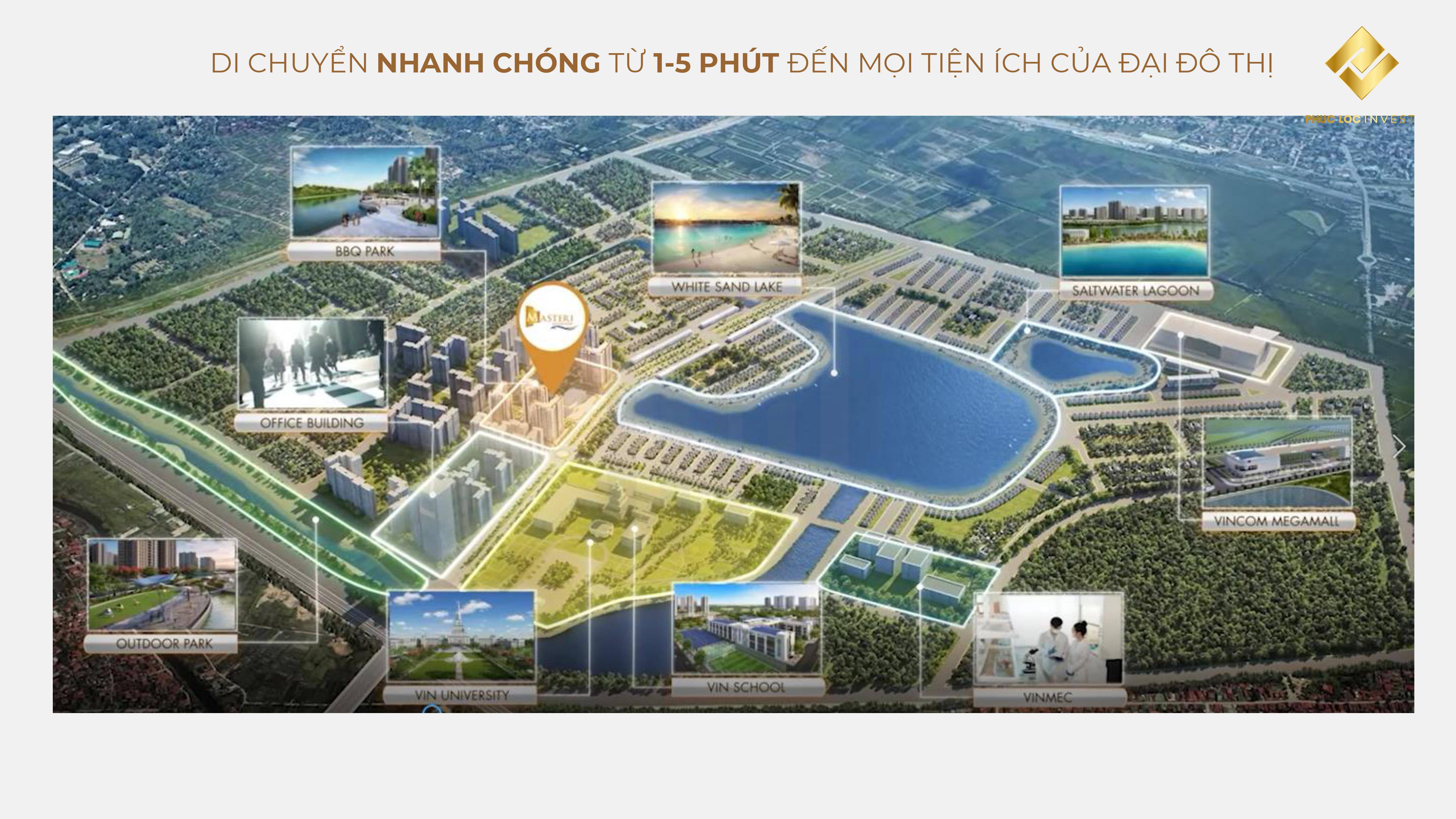 Từ Masteri Waterfront, cư dân chỉ mất khoảng 1-5 phút để kết nối đến toàn bộ tiện ích nổi bật của Vinhomes Ocean Park như hồ nước ngọt trung tâm, biển hồ nước mặn, đại học VinUni, TTTM Vincom Mega Mall, bệnh viện Vinmec, hệ thống trường liên cấp Vinschool,…