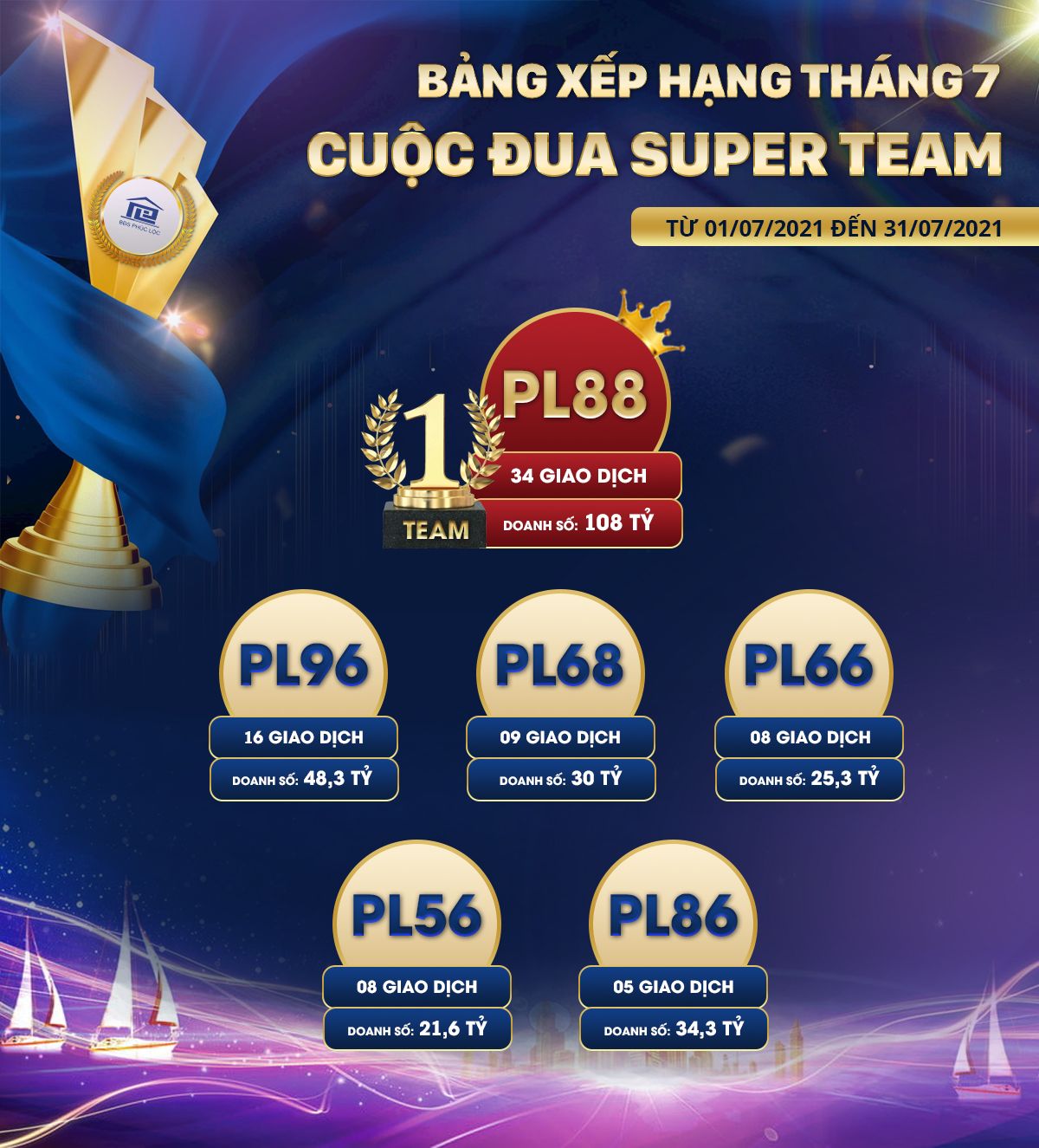 Đại lý chúc mừng Phòng kinh doanh PL88 đã xuất sắc giành được Danh hiệu Super Team Tháng 7 khi đem về 108 tỷ cho 34 giao dịch thành công. Đây chính là kỷ lục giao dịch cao nhất cho một team tính từ đầu năm đến nay. Nhờ sự dẫn dắt tận tâm của GĐKD Nguyễn Phương Sáng, các chiến binh của PL88 đã có một tháng đại thắng với thành tích cực kỳ đáng ngưỡng mộ.